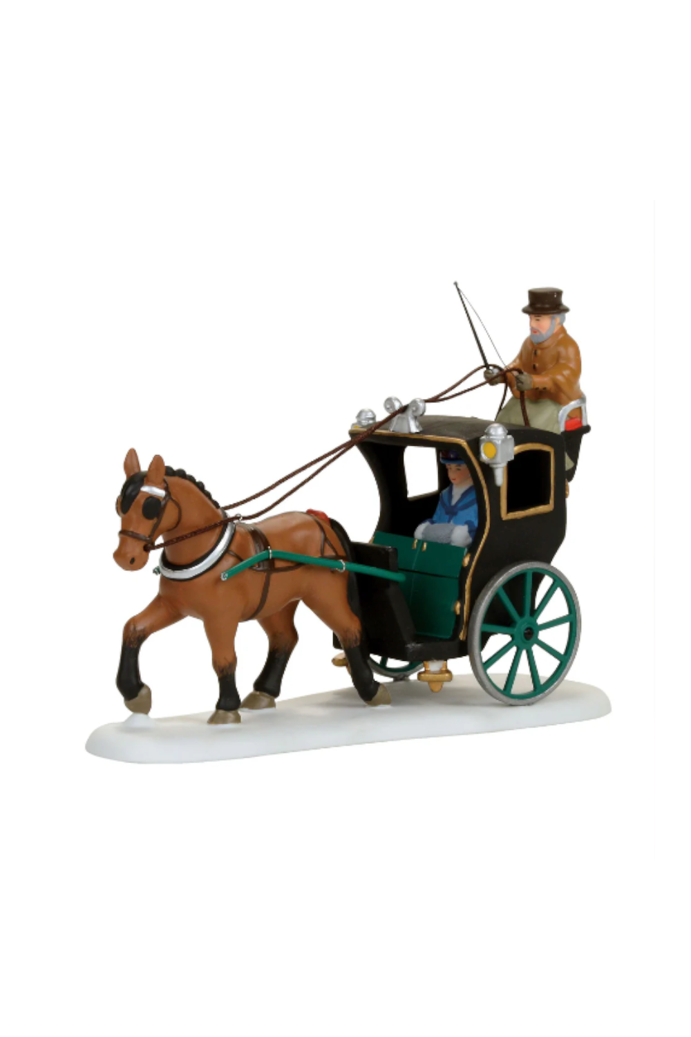 Part of the Dickens’ Village Series from Department 56, Holiday Cab Ride is a hand‑crafted, hand‑painted resin accessory introduced in January 2017. This charming piece features a Victorian gentleman guiding a horse‑drawn carriage through the snowy streets of London, with a lady seated inside wearing a blue outfit and holding a muff. The black carriage boasts green wheels and a green door, with open windows on each side and a silver‑colored light box. Measuring 4.25 inches in height, 2.24 inches in width, and 6.14 inches in length, it adds a festive touch to your holiday village displays.