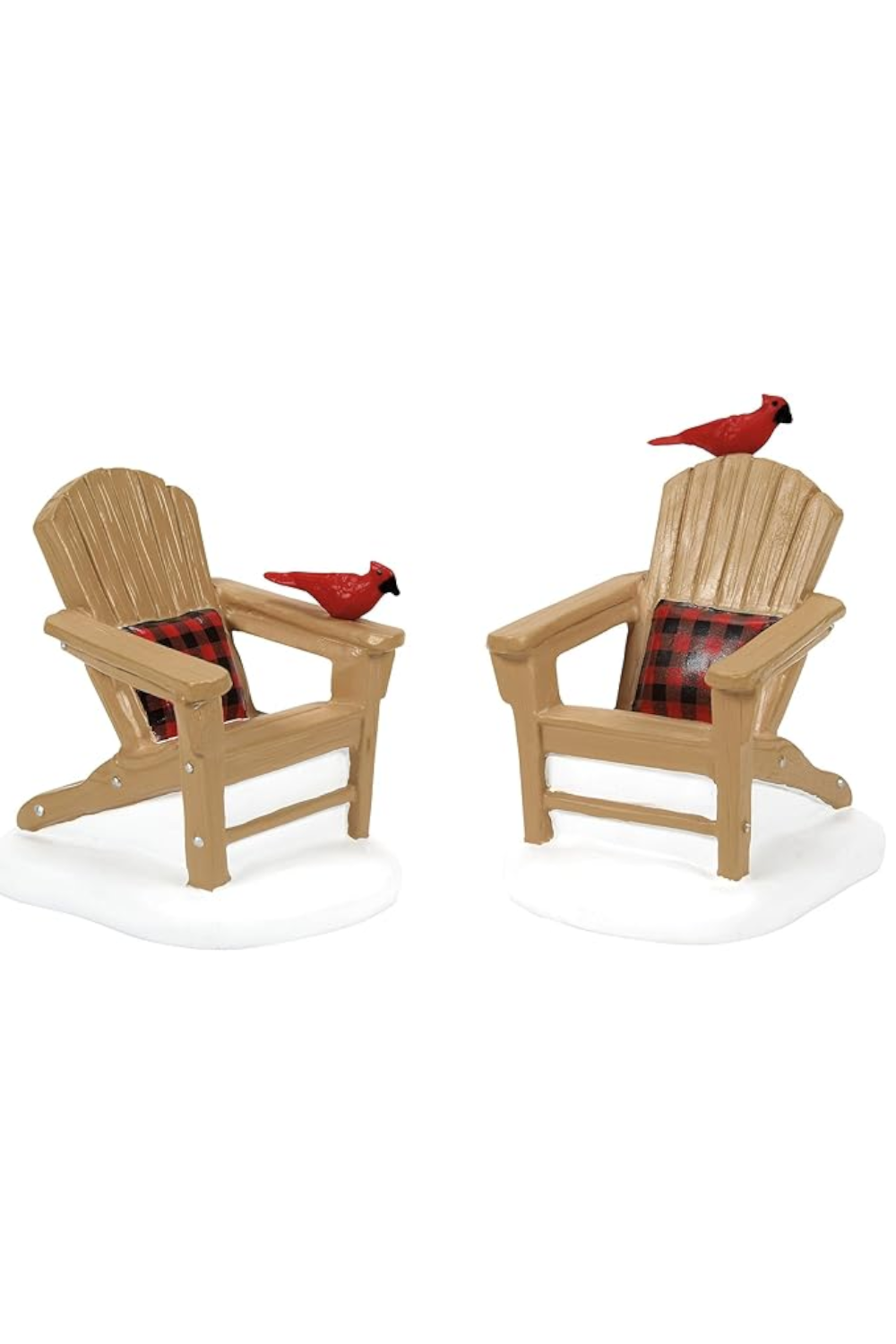 Tucked into a quiet corner of your holiday vignette or perched on a snowy windowsill, this charming set of two Adirondack chairs each cradling a bright red cardinal invites a moment of respite and seasonal joy. At just 2.3 inches tall the miniature scene evokes a gentle hush of winter’s stillness—perfect for adding a touch of woodland whimsy and warmth to any room.