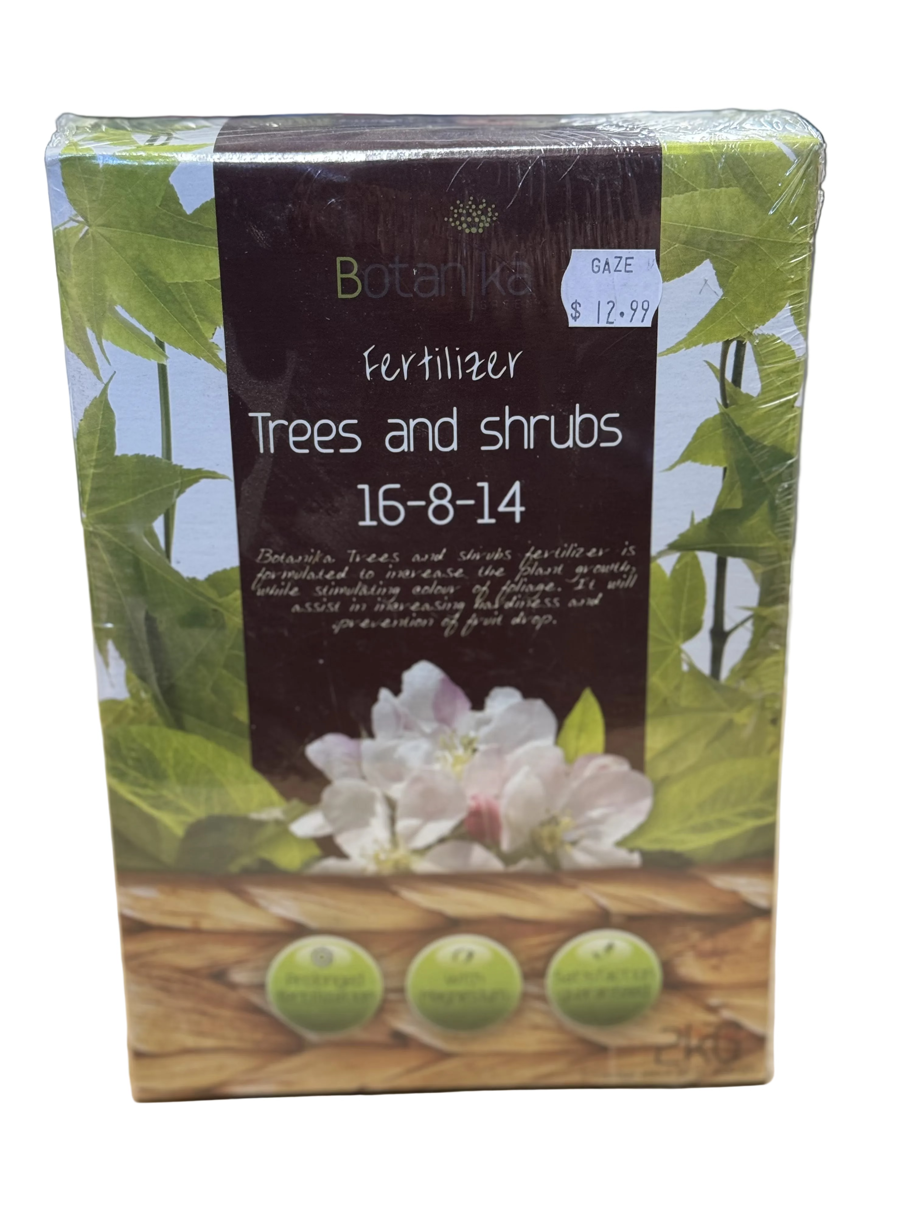 Botanika Trees and Shrubs fertilizer delivers balanced nutrition tailored for woody plants. This 16-8-14 NPK formula promotes strong root development, vibrant foliage, and healthy branch growth. The 2kg size is ideal for established trees, shrubs, and ornamental plantings in home gardens. Apply according to package directions for best results. Suitable for spring and summer feeding cycles.