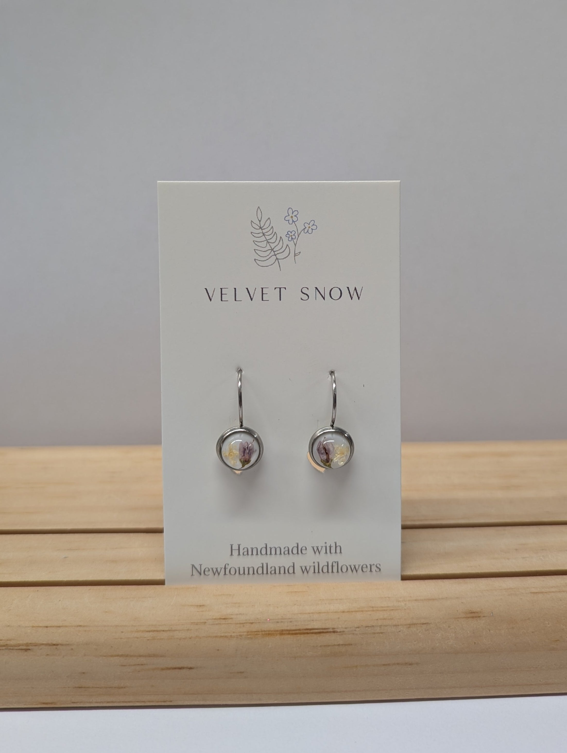 Velvet Snow Accessories is a handcrafted jewelry line based in Newfoundland, Canada. Designer Kim Cleary, born and raised in St. John’s, forages wild flowers and foliage within the province and turns them into beautiful, minimalistic accessories.