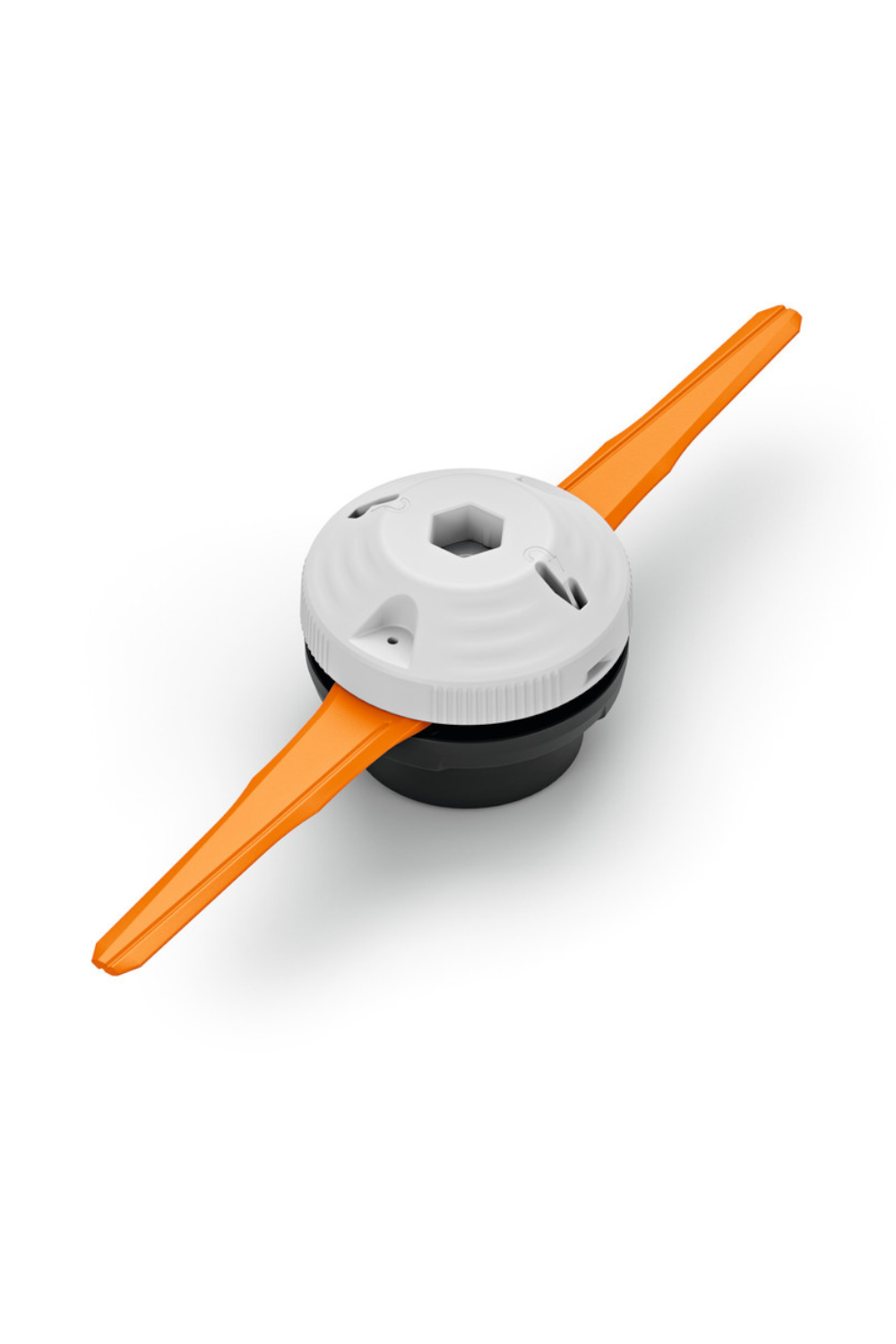 The PolyCut 6-2 has two moving plastic blades. Compared to mowing heads with three moving blades, the energy requirement is reduced when mowing, which increases the operating time when used with battery brushcutters. The slightly raised cutting height reduces undesired blade contact with the ground; this stops them from being subjected to excessive wear.